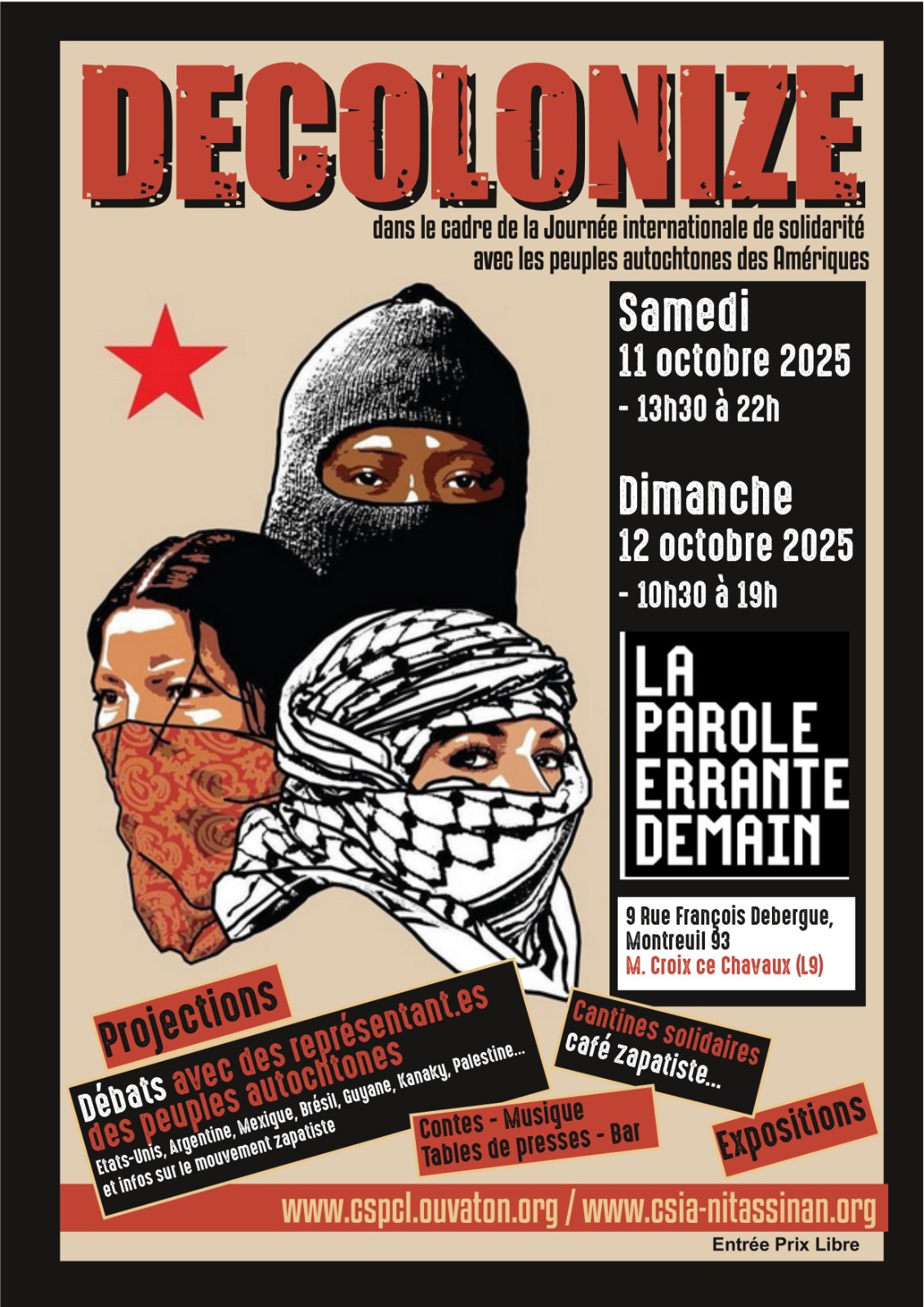 Cette année encore, à la Journée Internationale de Solidarité avec les Peuples Autochtones des Amériques organisée par le CSIA-Nitassinan, qui en 2025 prend la forme d’un week-end de solidarité où une grande place sera également faite à la solidarité avec le mouvement zapatiste, les tables rondes seront riches en invité·e·s autochtones de plusieurs régions d’Abya Yala : Puelmapu (ARgentine), Brésil, Guyane, Mexique, Île de la tortue (États-Unis).