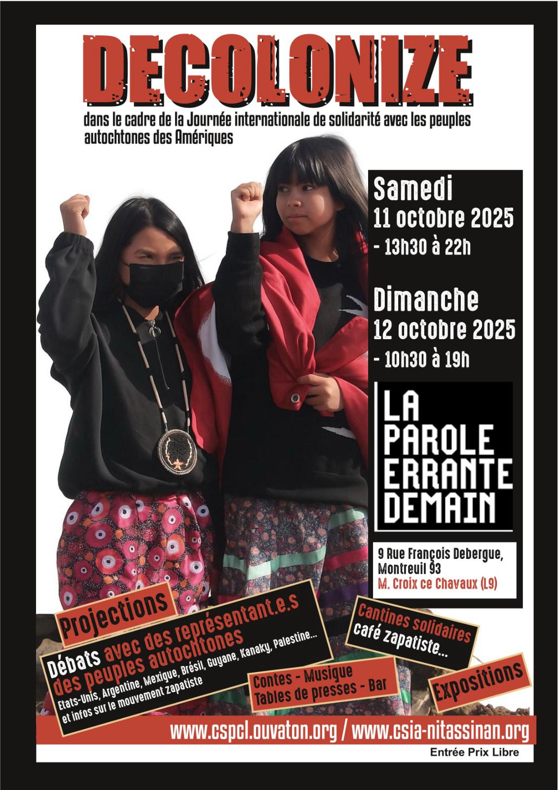 Les 11 et 12 Octobre 2025 se déroulera notre Weekend de solidarité internationale avec les autochtones des Amériques à la Parole Errante - 9 rue François Debergue - 93, Montreuil.